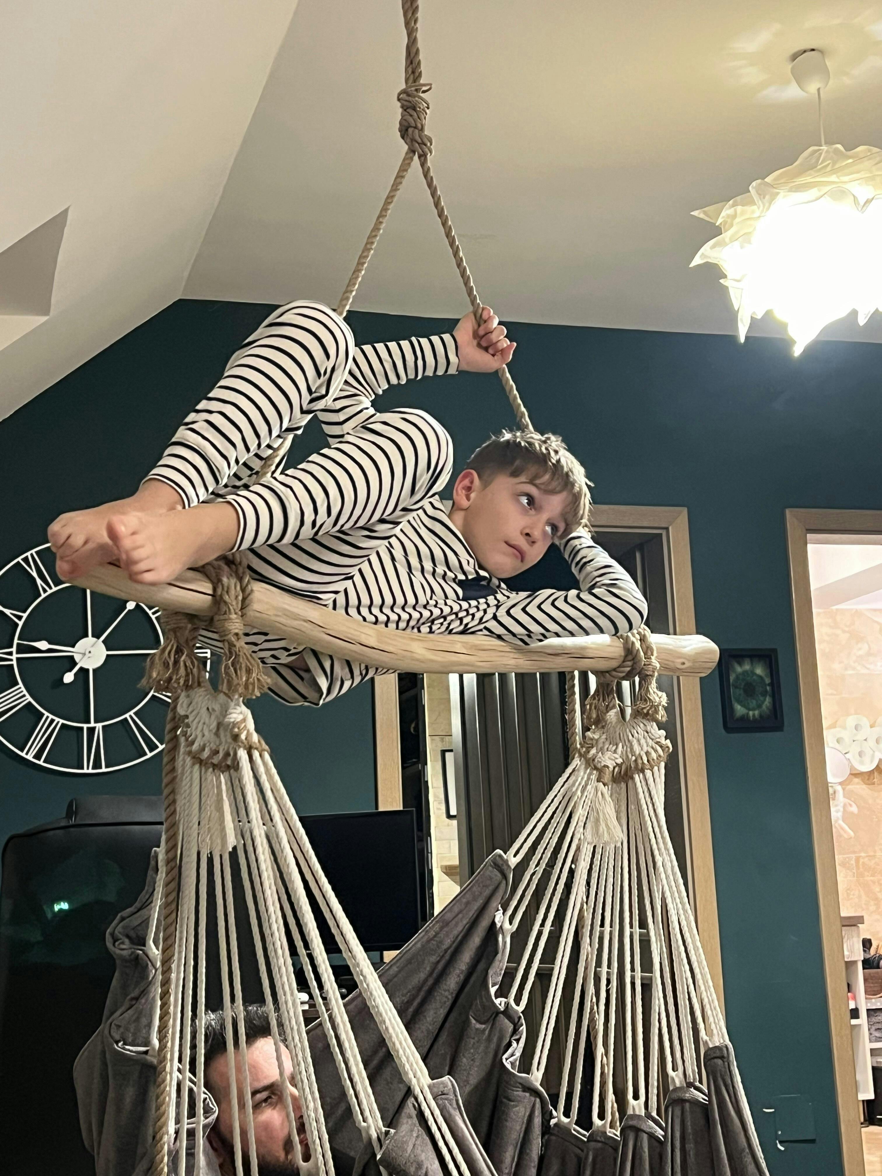 The hammock pole comes with the rope already tied. If it is necessary to adjust the height of the chair, untie the knots, reposition the pole at the desired level, so that it is horizontal, and proceed as in the instructions for retying the rope.